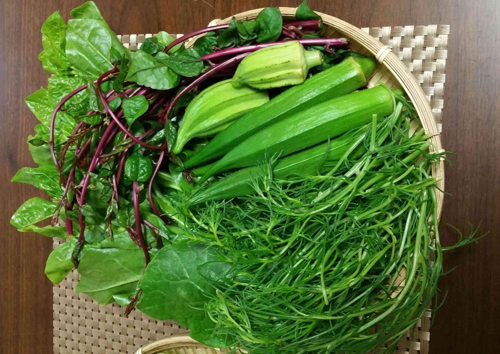 これも早朝の無人販売所で知らない農家のおばあさんからタダ同然で分けてもらった夏野菜たち、オカヒジキ、ツルムラサキ、ツルムラサキのツル菜、オクラ、そして特大のオクラ!