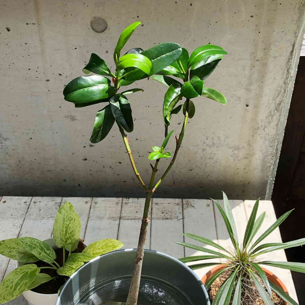 水槽用のマングローブ(たぶんヤエヤマヒルギ)が3年目になりました。魚も大きくなって木を倒すのでバケツに避難中です。真ん中の枝からもやっと葉っぱが生えてきました。