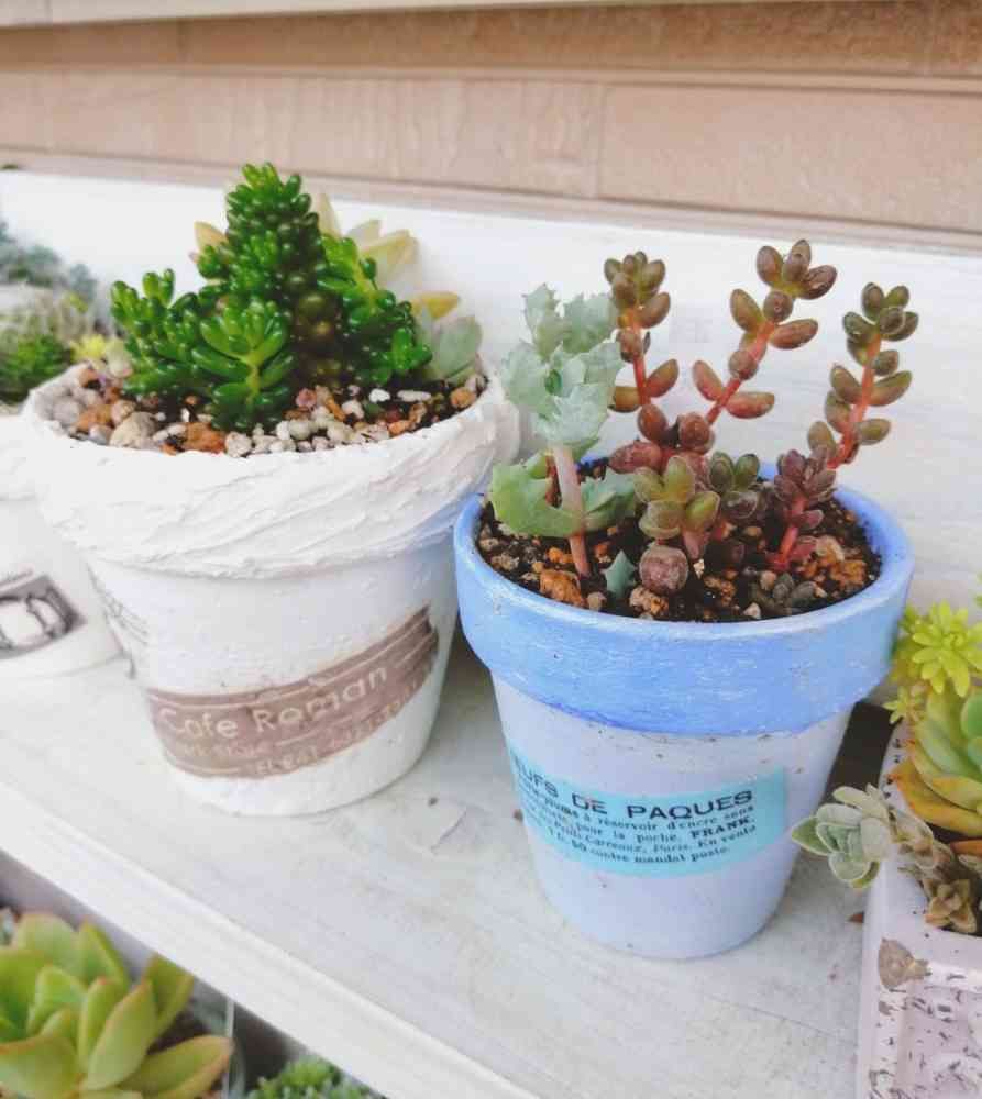 左、ホイップ風リメ鉢にレッドベリー♥️。後ろには見えにくいけど、先日鶴仙園でお迎えしたゴースティンとイードンスノーを。