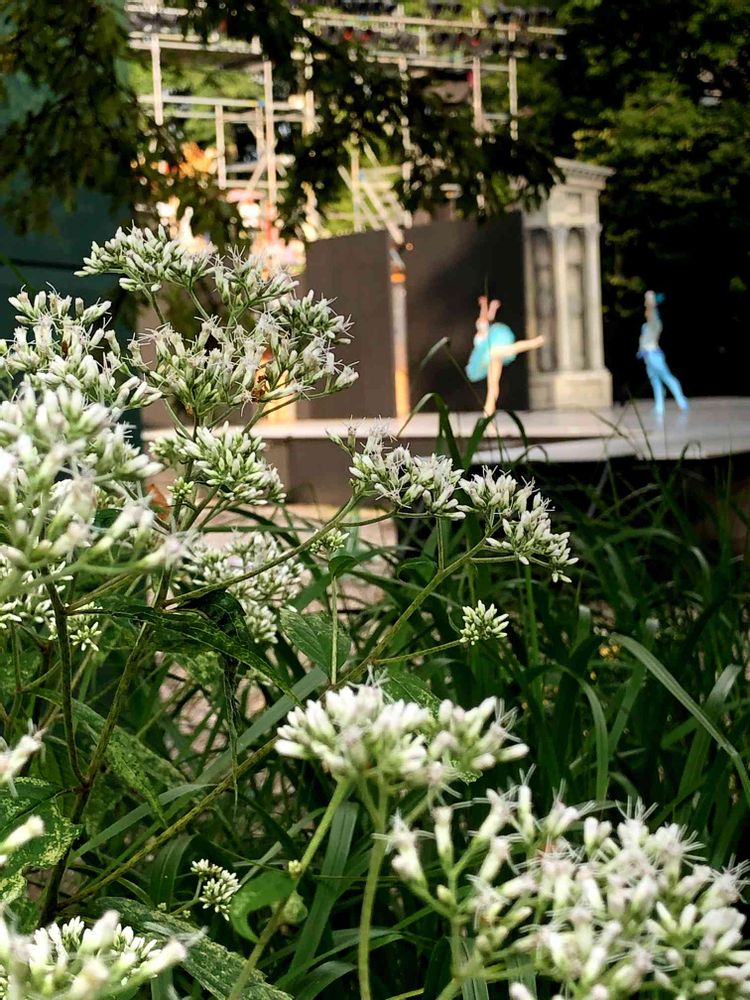 たくさん咲いているヒヨドリバナの向こうでは清里フィールドバレエ公演のリハーサルが行われていました