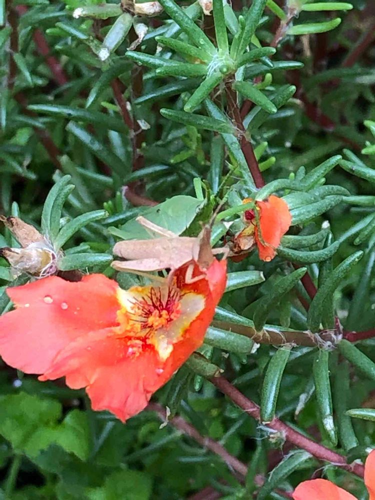 茶色のバッタ?がマツバボタンの花びらを食べている後ろに 緑バッタが見つめてる⁉️ バッタの気持ちは…