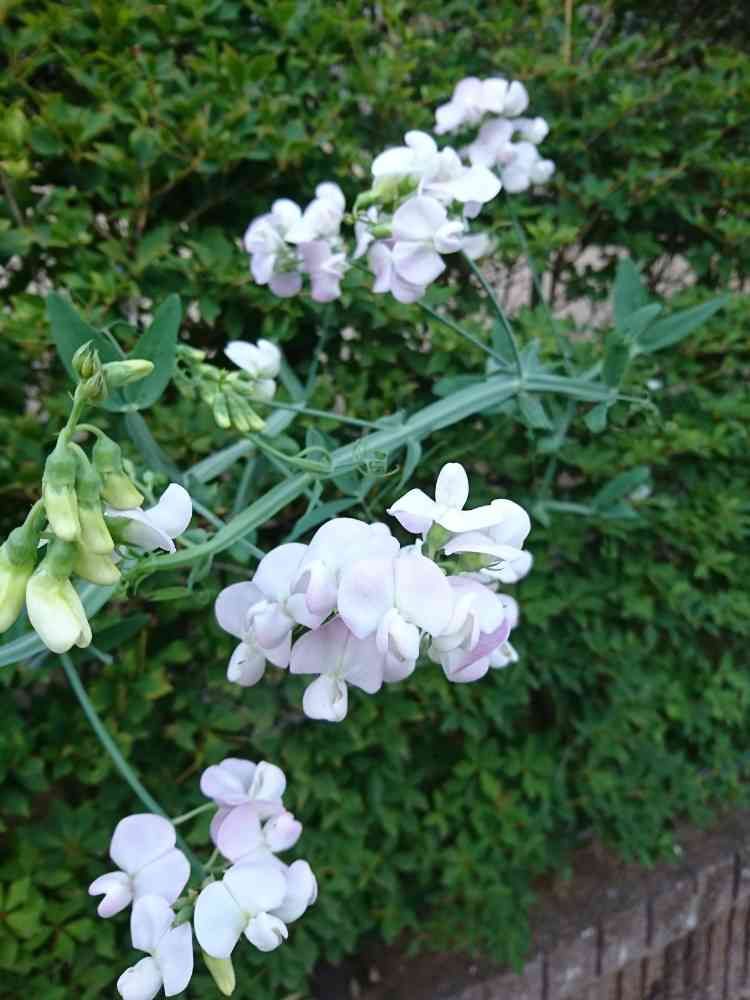 ご近所さんの生け垣に毎年咲くスイートピー。今年は今の時期にも花を着けています。