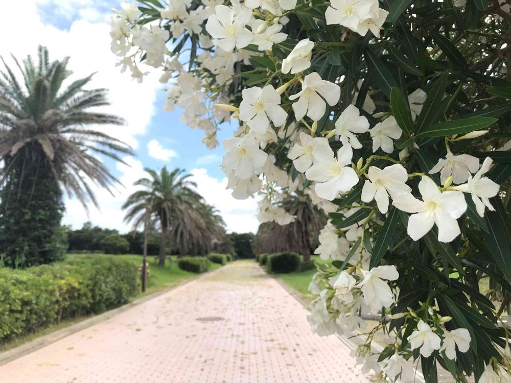 白い夾竹桃、青空に映えて綺麗ですね😍