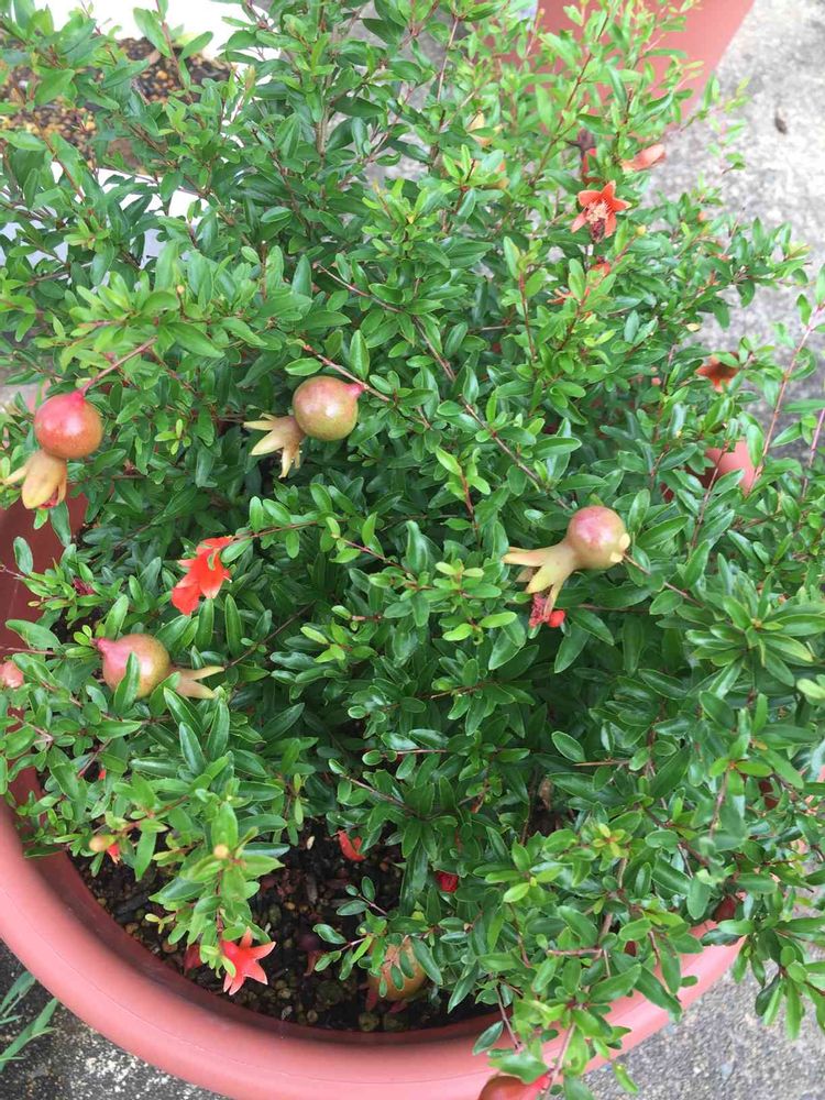 このザクロ、父が買ってきたザクロなのですが、父が他界して五年位経った頃、突然鉢に芽を見つけました🌱植え替えて大きく育って花は咲くのですが実がつかず、残念に思いながらも