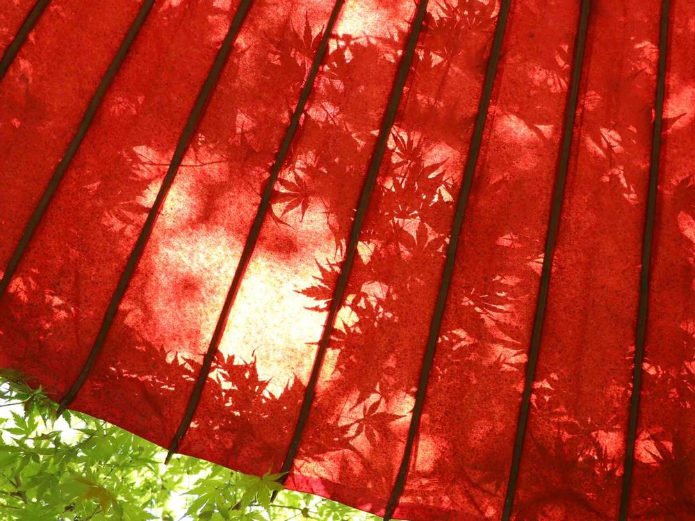 赤い番傘に、風にそよぐもみじの影が綺麗でした✨
