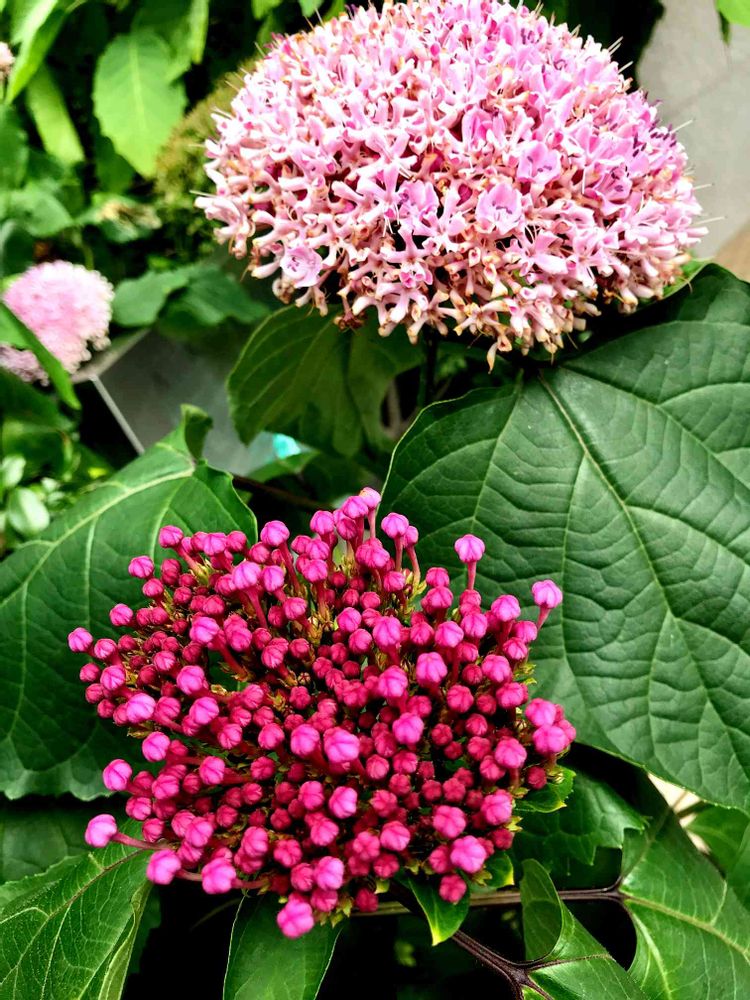 今朝通ったら、濃い緑の葉っぱの上に ピンクの花がたくさん咲いていて、