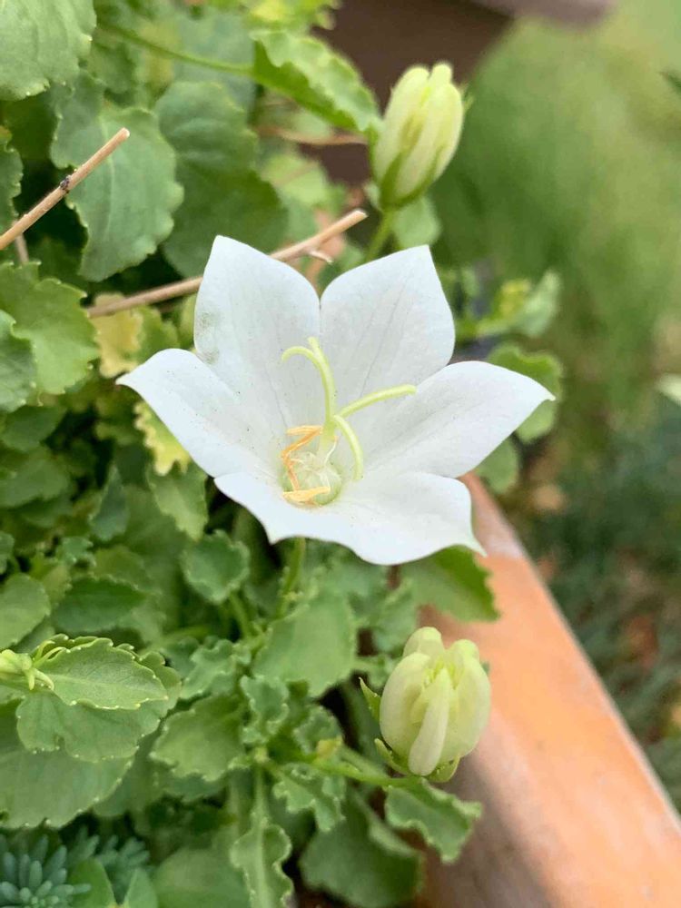 白い桔梗さん、綺麗だね〜💖透き通るよう♡カンパニュラ パールって素敵なお名前なのね😍こんなに細い茎でも、きっと持ちこたえてくれたのだろうな☘️☘️🌼頑張ったね☘️