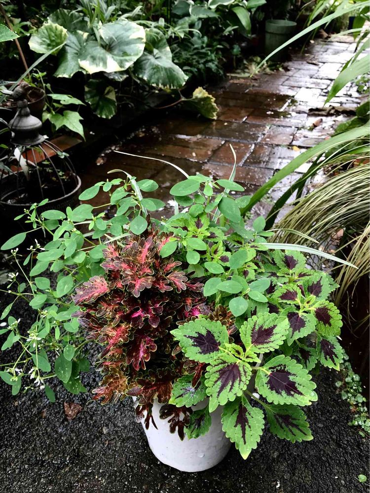 先日、値下げされてたので買った寄植え、赤いコリウスとユーホルビア、ミスカンサスが入っていて、何かが枯れて一株分のスペースが空いていた。鉢を入れても300円じゃ、お買得かな?グリーンのコリウスを追加した。やっと皆んな生え揃って来た✨