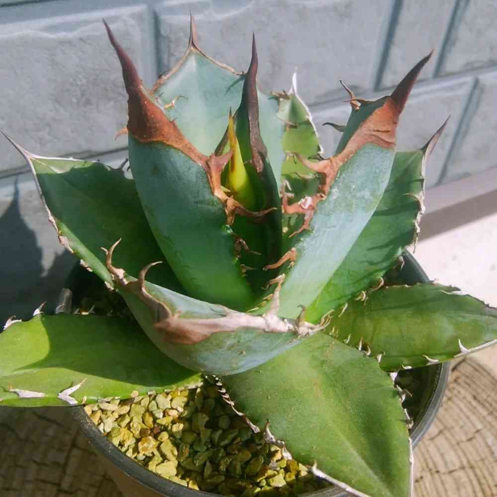 ウチのアガベ達は真夏のビニールハウス内で暑さに耐えているからか、皆新葉は閉じ気味ですね~!