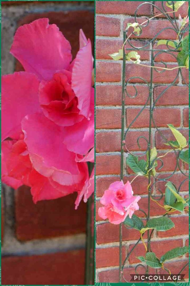 まるでバラの様に咲くピンクの八重、マンデビラ・ピンクパフェ(左)とトレリスに咲く様子(右)。