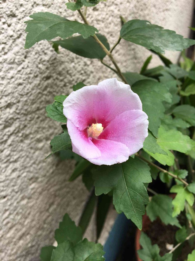 ものすごく久々の投稿。背丈が高くなりすぎ、知人があまりに大胆にノコギリで切ってしまったムクゲが、3年経って花を咲かせました。太い幹からひこばえが出て、そこから。生命力に驚きです。