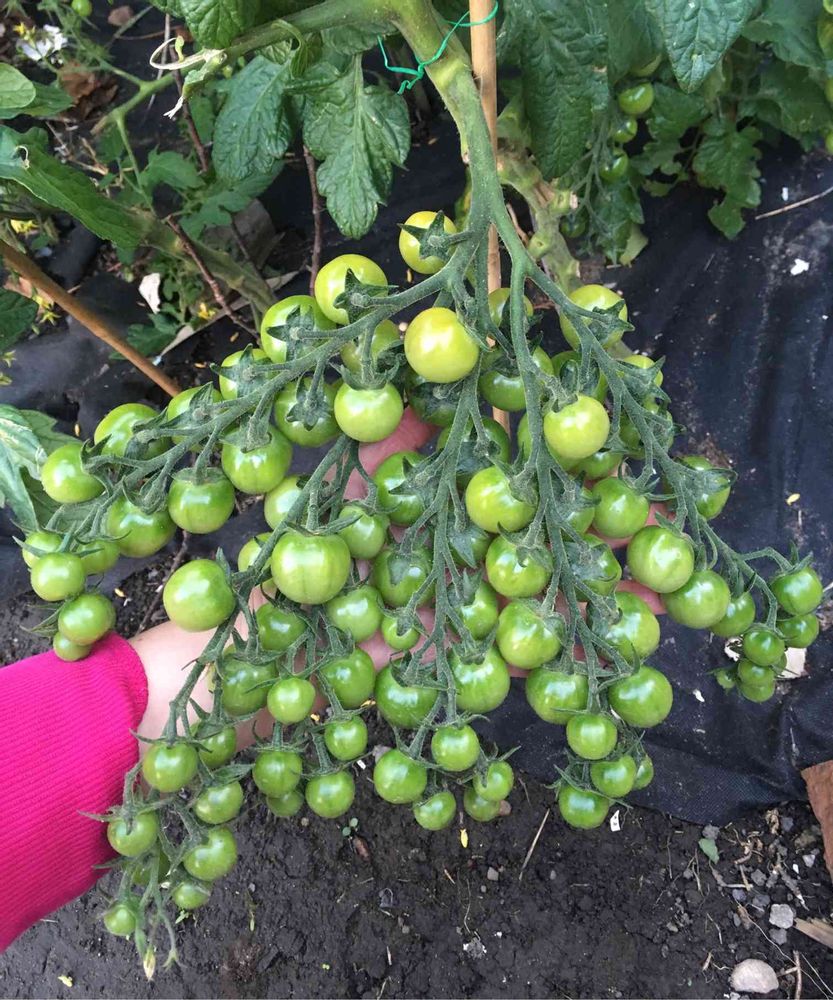 種から育てた初栽培のミニトマトの鈴なり果房、未だに緑ですが順調です😊。