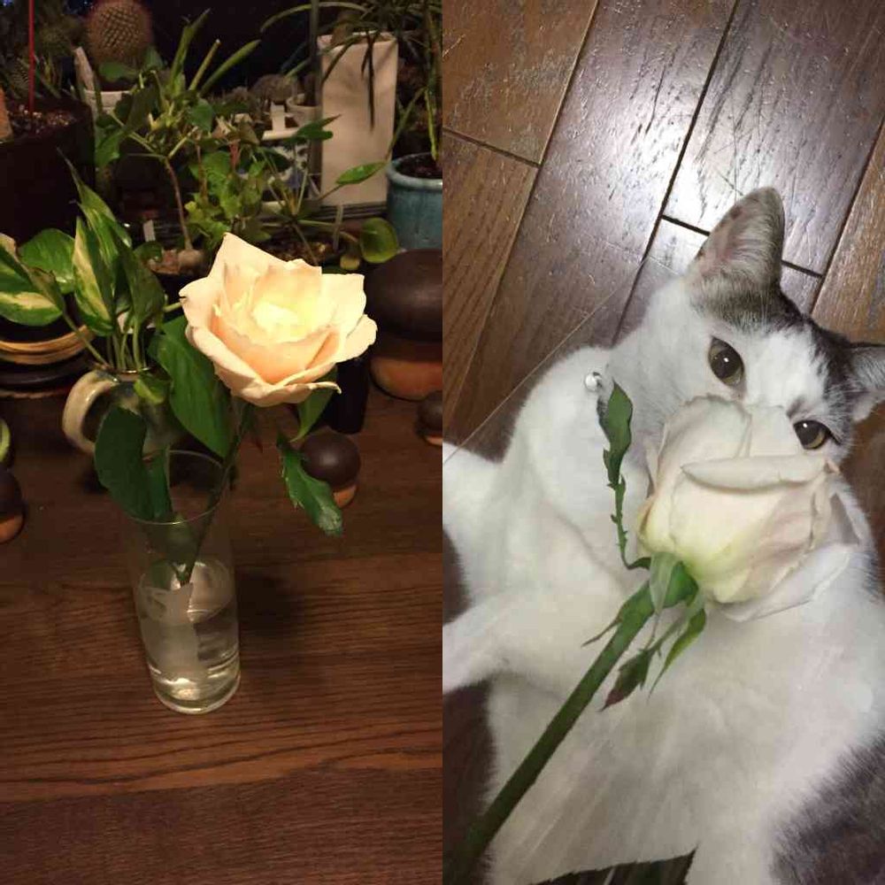 お花屋さんでおまけで頂いたバラ一輪。チップくんはお花を愛でる気持ちあるのよねぇーー。
