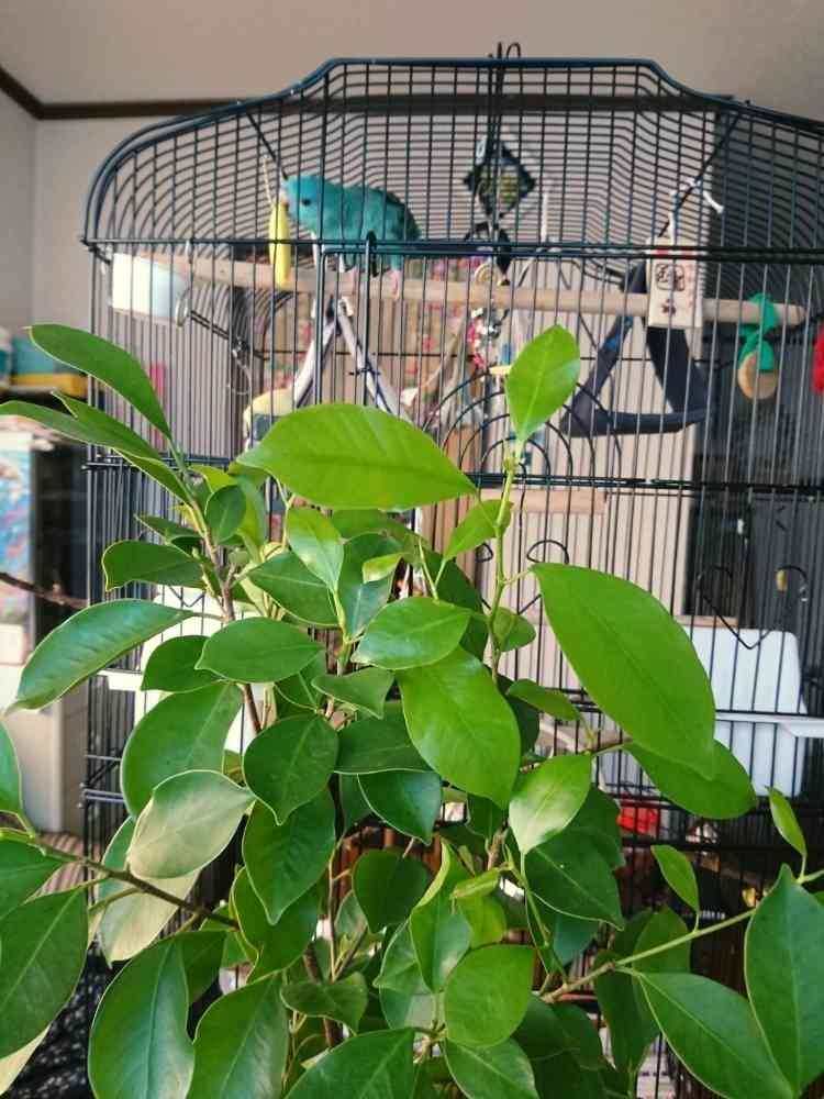 後方で戯れてる🐤サザナミインコ さんの 止まり木 になるように大きく育ってほしいところです。