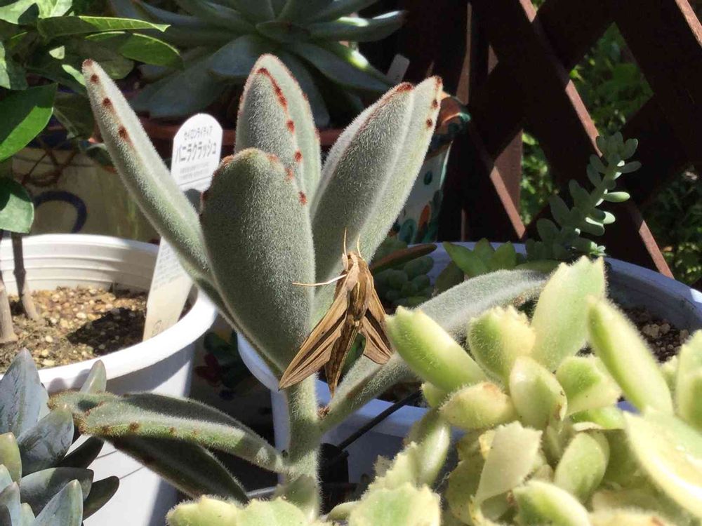 ウッドデッキに多肉がいくつかありますが、月兎耳に蛾が。