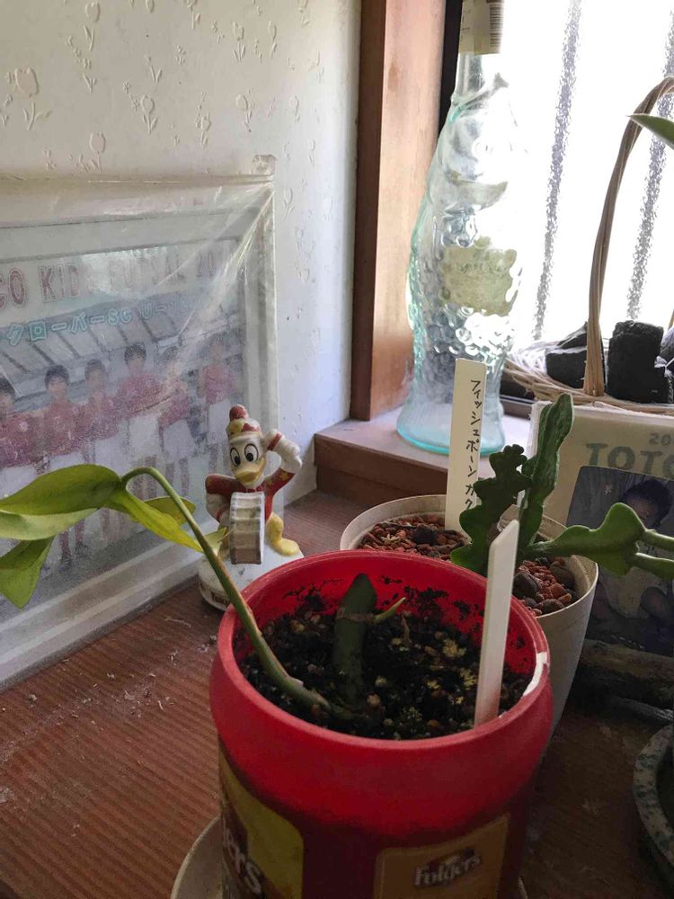 コーヒーの入れ物に穴を開けて作った鉢に、ヒメモンステラを植えてたんだけど葉っぱが元気なくなり、、置き場を変えて様子見ていたら、新芽登場。
