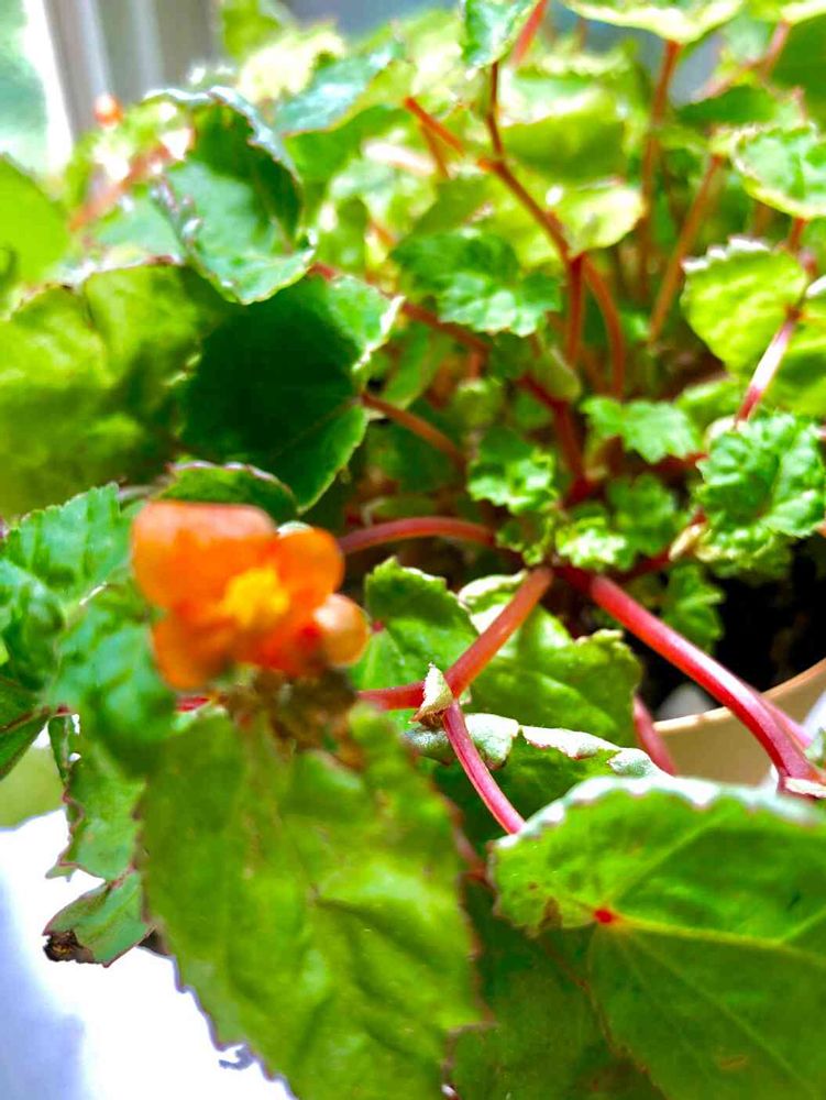 明るい黄緑の葉と、黄色のシベを見せてる明るいオレンジの小さな花と、紅い茎のコントラストが素敵です.ஐ*॰¨:*♡