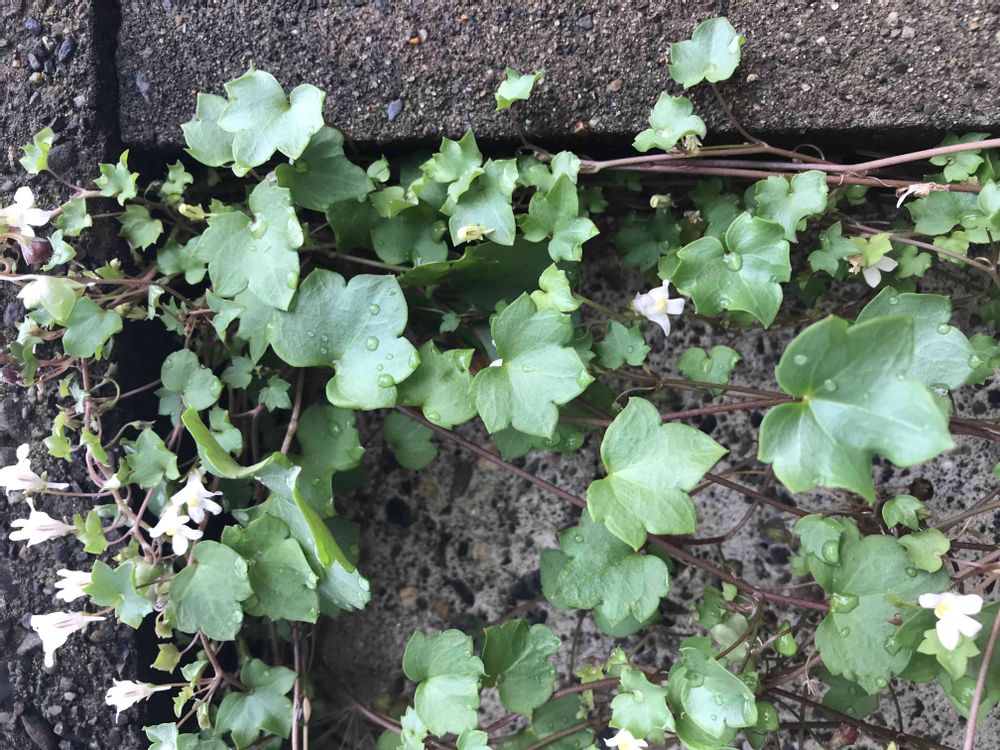 ブロック塀に垂直に張り付いています。ツタバウンランみたいな葉っぱですが、花が違うな、と。