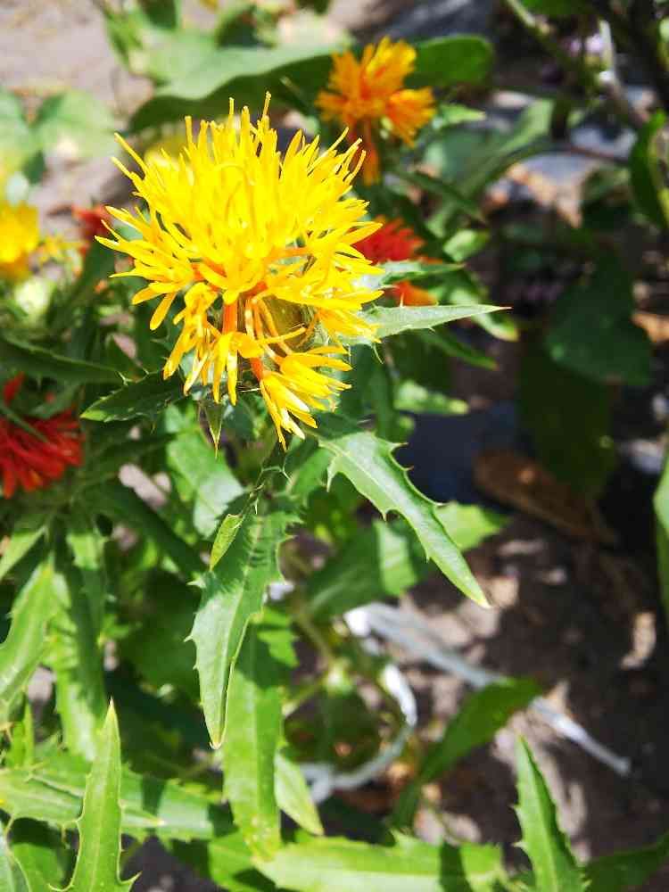 暑い中紅花が咲いていました。