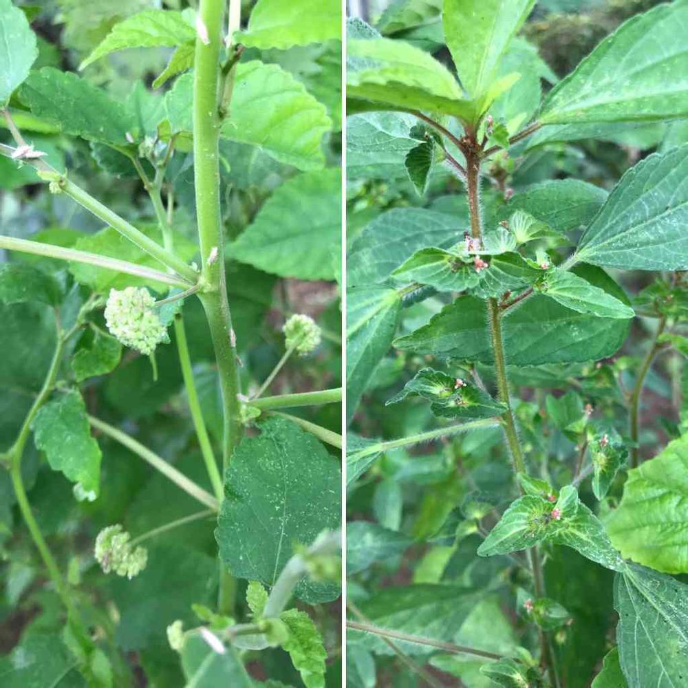 ちゃむさんに教えていただきました。左がクワクサ。右がエノキグサの雌花。どちらも花が咲いているんですね😓