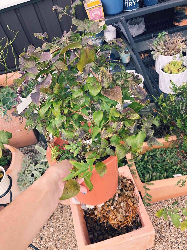 2.植え替え時期ではなかったので 植え替え予定の植木鉢に 鉢底石だけ敷いた状態で 買ってきたままの クレマチスの鉢を入れておいた