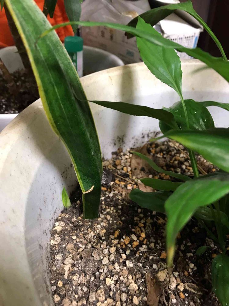 サンスベリアが元気なくなった時に一本何気なくスパティフィラムの鉢に挿しておいたら、今日赤ちゃんを発見。