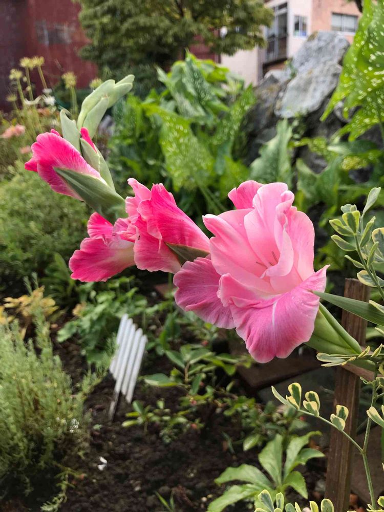 この種類のグラジオラスは、ひとりで立ってられないのよね😅