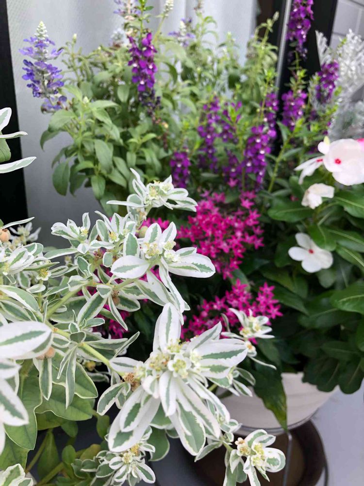 ペンタス、ニチニチソウ、アンゲロニア、ブルーサルビア。