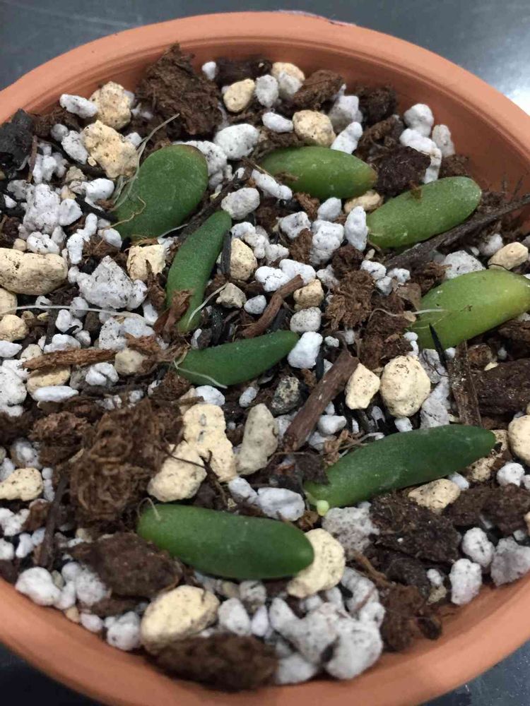 ポロポロ取れてしまった虹の玉さん。葉挿しにしてみたら、根っこがたくさん出てきました〜♡よく見たら芽も発見👀