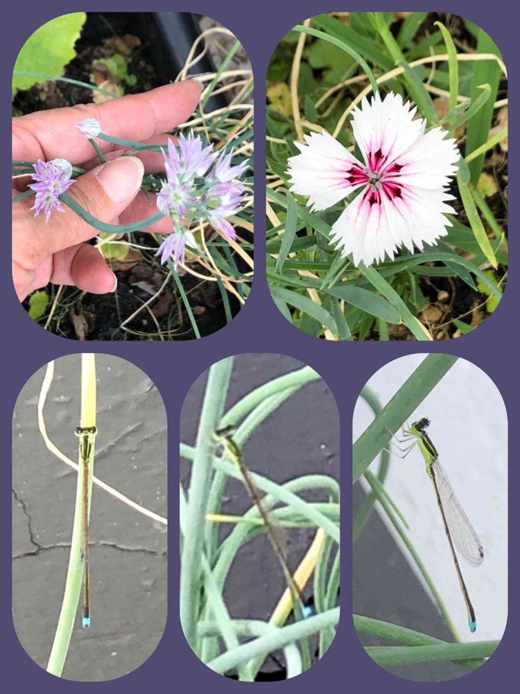 チャイブの細い葉っぱに!ほっそい糸トンボが来た(ΦωΦ)ホホォ…