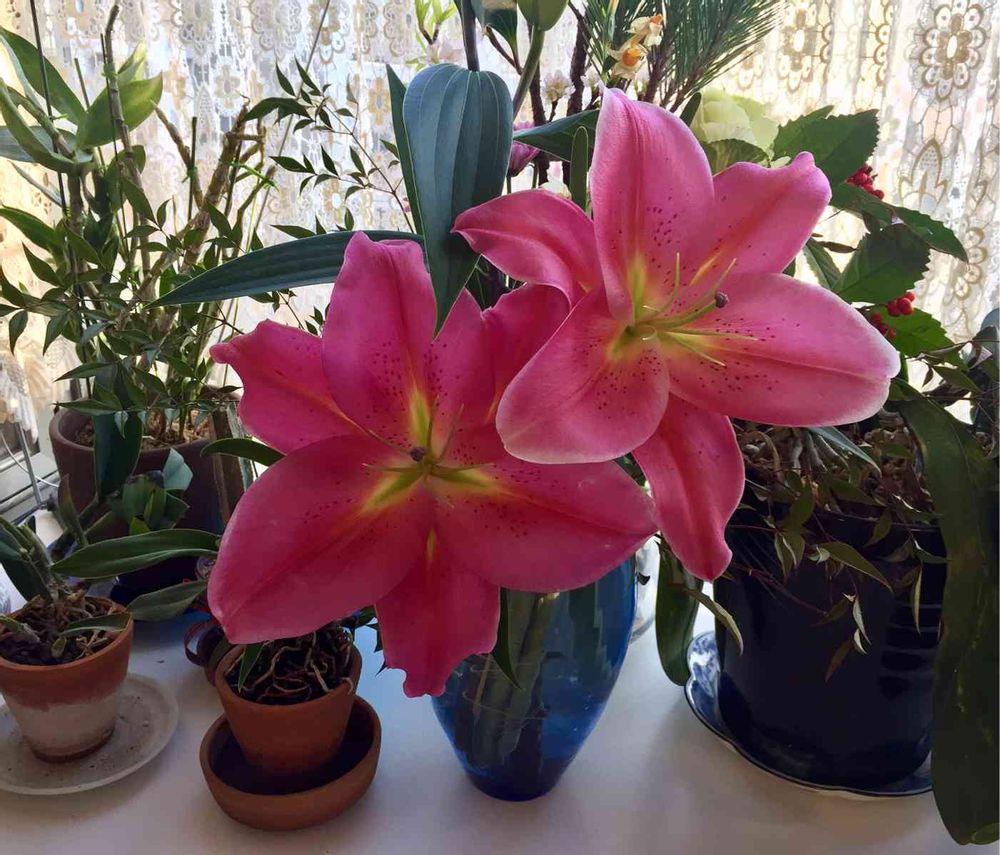 いただいた百合さんを出窓のお正月飾りに足したら爆発したように開いて松も桜も隠れちゃった〜😦🌸