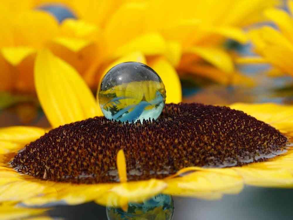 水の上に浮かべたひまわりの上にガラス玉を置いてあります😄
