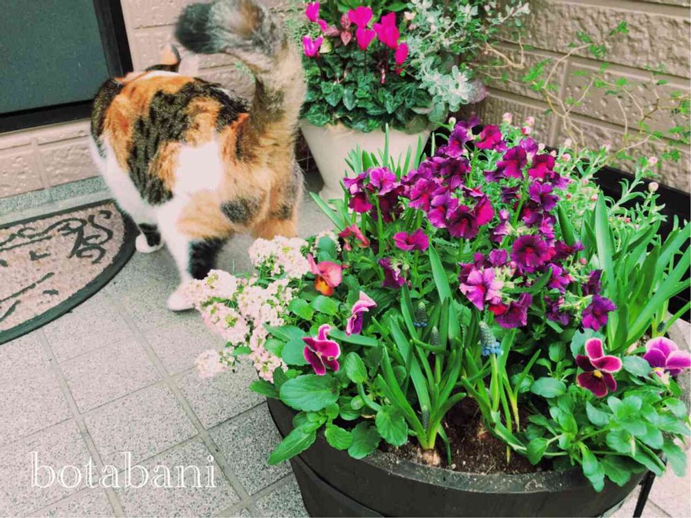 猫はご近所の三毛猫さんで、花が好きなのかよく遊びにきてくれます🐈