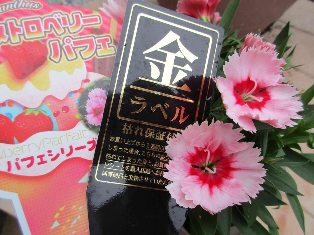 昨日、HCでこんな気合の入ったタグの付いたお花を買いました。枯れ保証があるのは知っていたけれど、実際に保証が付いたお花を買ったのは初めて。ダイアンサスは必ずクロウリハムシがやってくるので最近敬遠していたけどゴールドタグとパフェの可愛いタグ、近くに飾ってあった生産者さん達の素敵な笑顔に思わず手に取ってしまいました(*´▽`*)