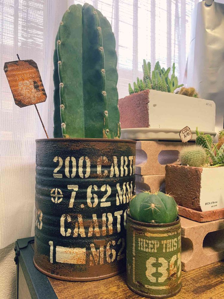 早速カッコいいねこさんのリメ缶に植え替えました。サボテン🌵も大好きで元気もらえます╰(*´︶`*)╯♡