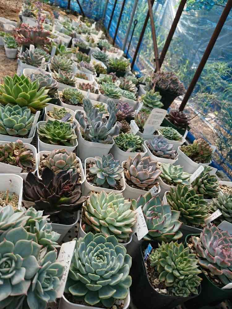ちょっと前の多肉ハウス。ハウス内は一応寒冷紗でなんとなく明るい日影な感じなので大丈夫ですが、屋外放置のセダムが幾つか★に……。