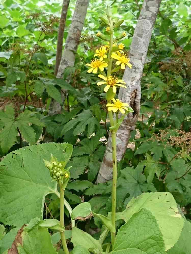 なるさん投稿のマルバダケブキかと思っていのに、咲いてみたら違うみたい!花の咲き方はオタカラコウのようでもありますが、何の花でしょう?