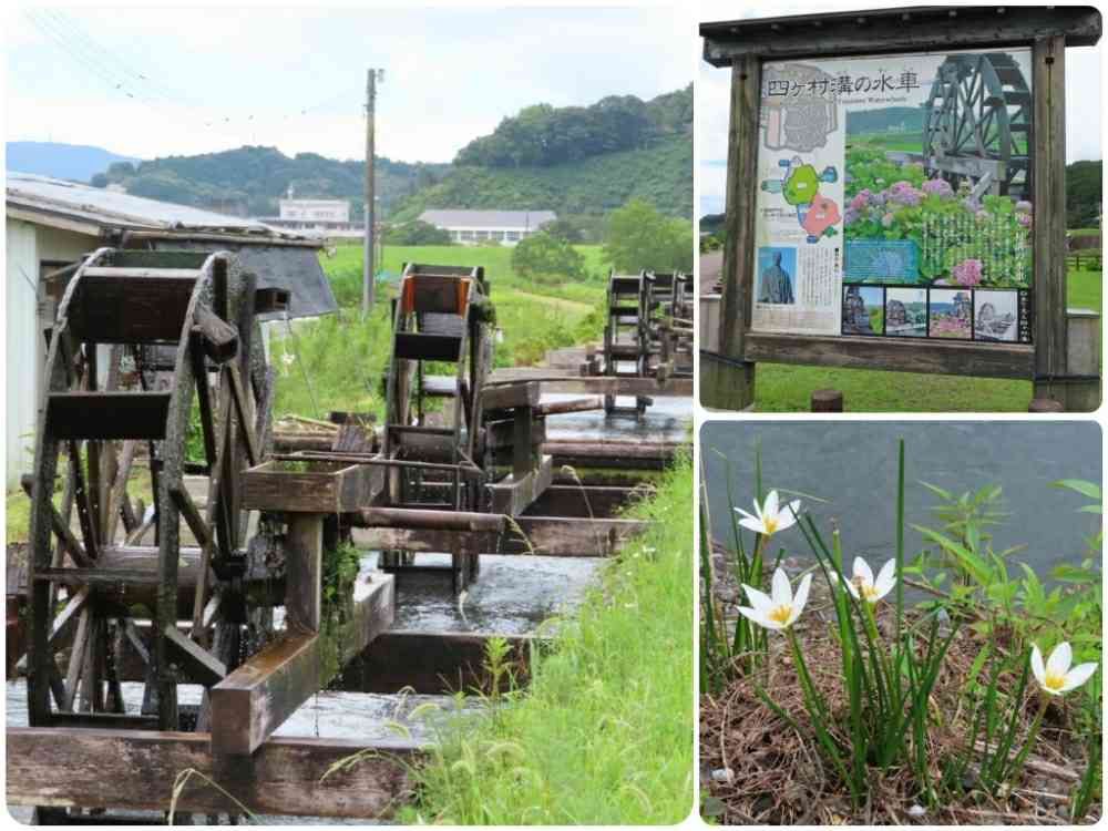 水車の里では、田園の中の水路に可愛い水車達がゆったりと回り、水辺にはゼフィランサスでしょうか白色の可憐な花が咲いていました。