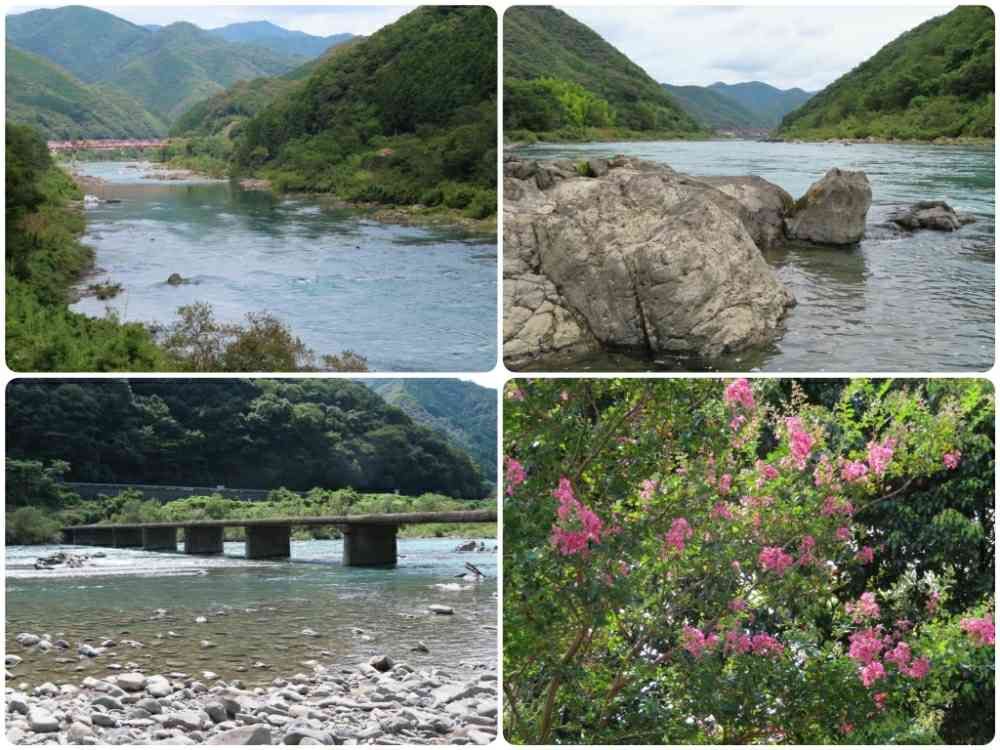 日本最後の清流四万十川の中流は山合に囲まれ、大きい岩もあり、沈下橋の下の流れも早く、岸辺には百日紅の花が咲いていました。