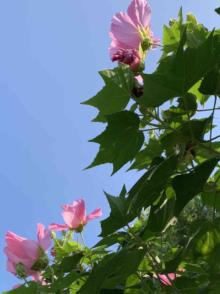 お早うございます。素敵な写真の花アングルですね。空の青と芙蓉のピンクがとてもマッチしてますね。(*^^*)