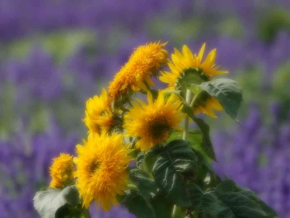 フォローありがとうございます(^^)ノこちらからも.フォローさせていただきますね(^人^*)宜しくお願いいたしますm(_ _)m多輪咲きの八重のひまわり、いいですねー(^^)バックのお花はラベンダーでしょうか?ひまわりの黄色を引き立てていますね♪(*^^)v