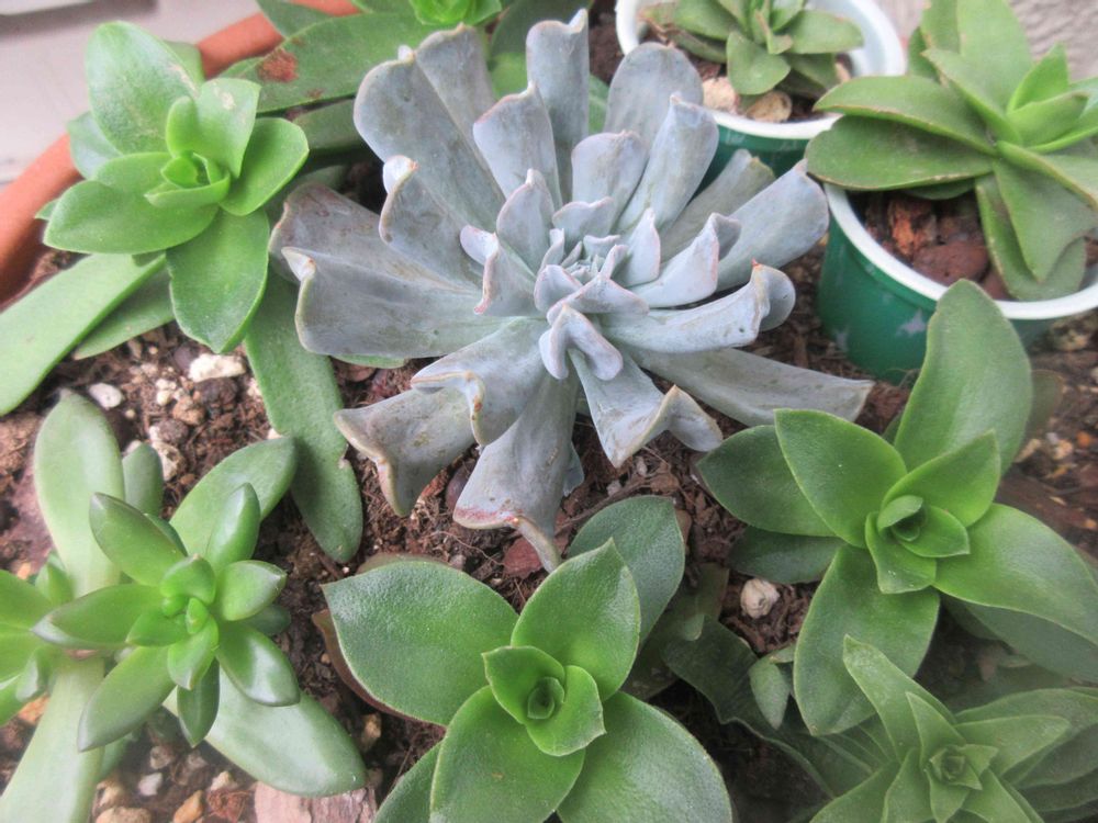 多肉🔰名前は覚えていないが挿し穂から根付きました。たくさん根付いたので真ん中の☘はお引越し考え中です。
