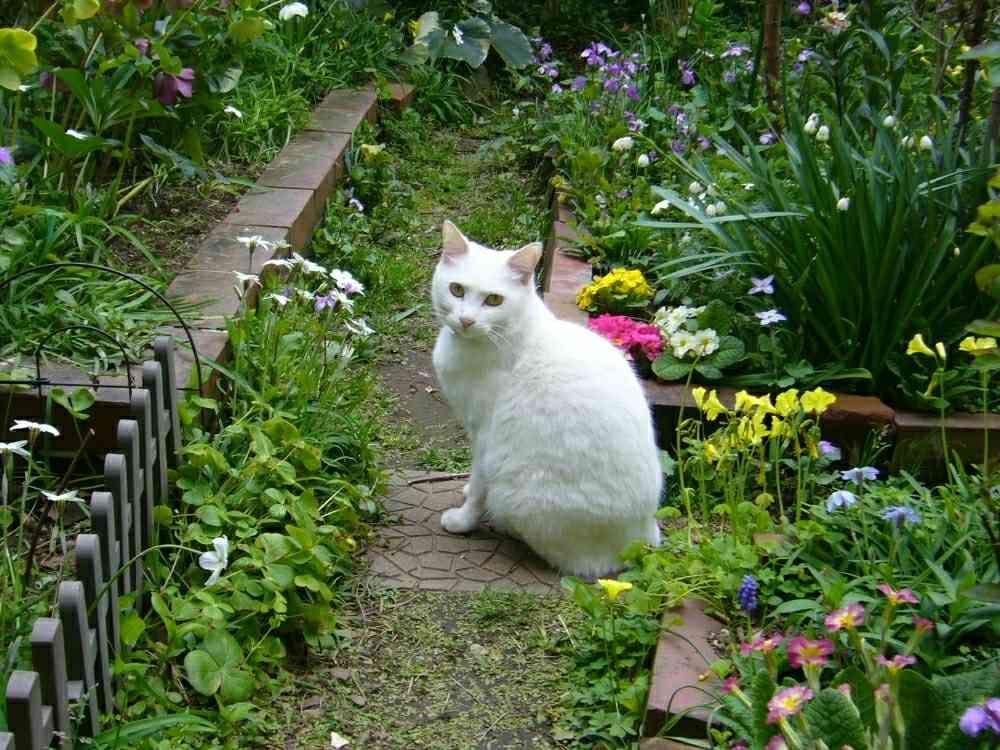 可愛らしいお花達のお庭と白い猫ちゃん、