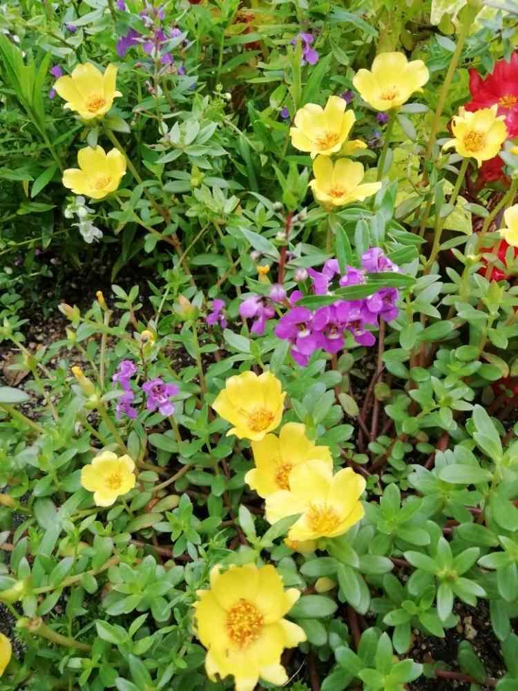 小花が咲いているお庭 私大好きです😊ポーチュラカの黄色が映えますね🥰元気頂きました😊