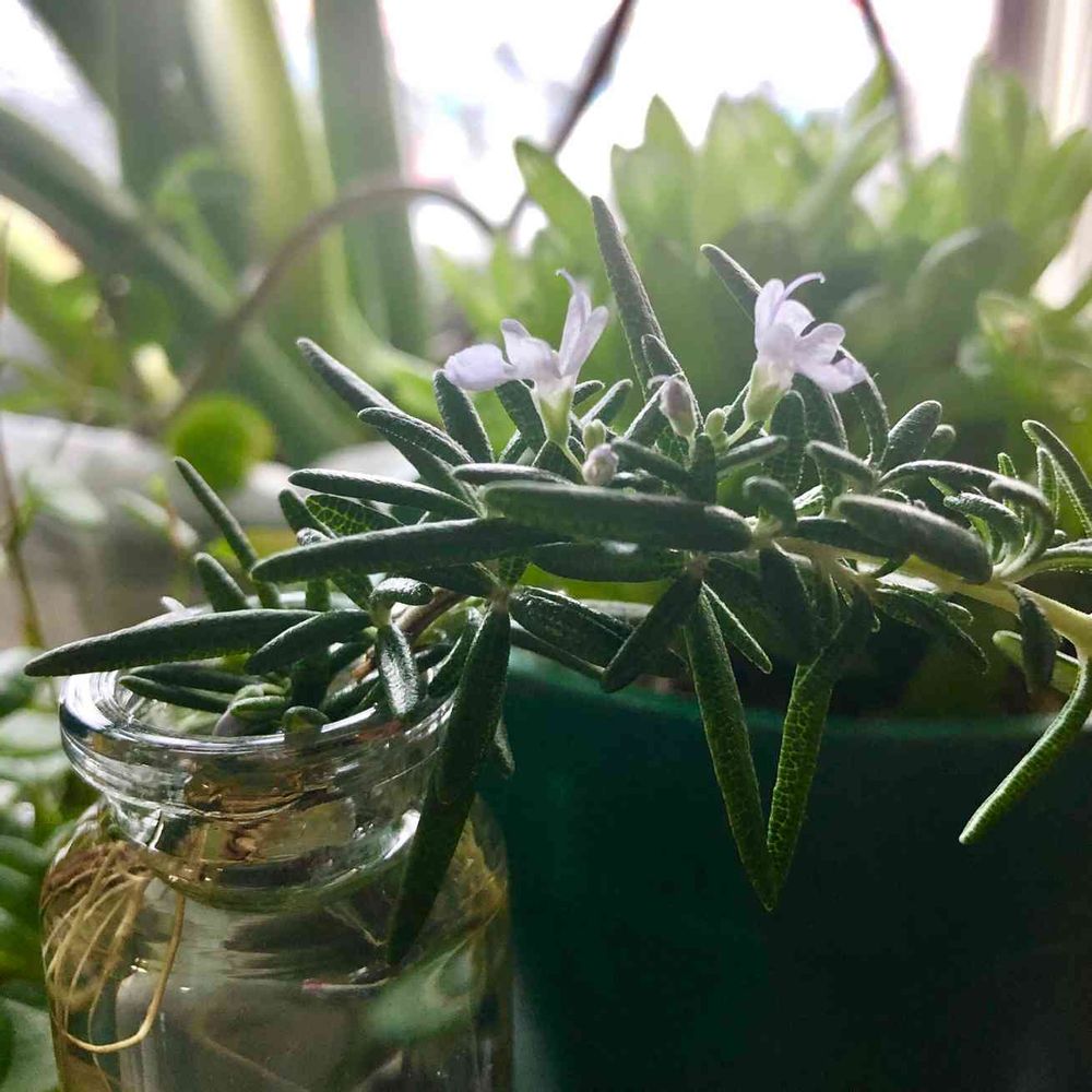 水挿しにしたローズマリーに薄らムラサキな小さな花が咲きました😋