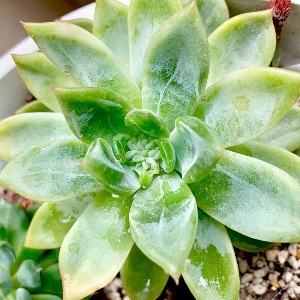 メキシカンサンセットと同一種と呼ばれているやつですね、ピンク色になりやすい方をメキシカン、青い方をブルーシャトーと呼ぶそうです。 これは石化(せっか・いしか)ではないでしょうか。成長点がひたすら分頭していく個体のことをそう呼びます。メキシカンサンセットは石化しやすい個体のようなので(エケベリア本より)、安心して育ててあげてください。