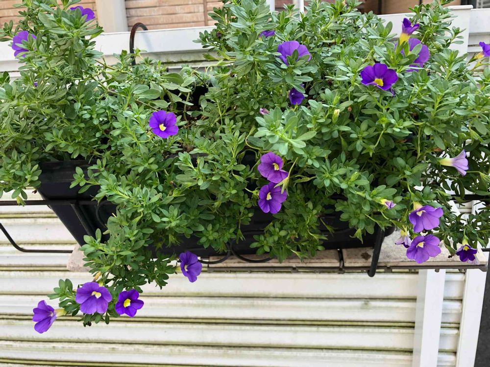 先週見たある番組で、ロンドンにあるスタジオの真っ白の壁に黒いアイアンのバスケットで紫系のペチュニアみたいな花がこんもりと何個も飾られてた姿が映っていたのが頭から離れず、、今日、我が町の花屋さんを4軒はしごしてやっとみつけた🚲🚲