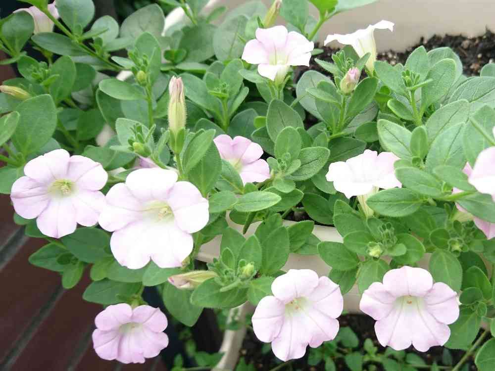 ご近所さんからいただいたものを挿し芽で育てた、ペチュニア ソフィアの宝石ホワイトピンクです。