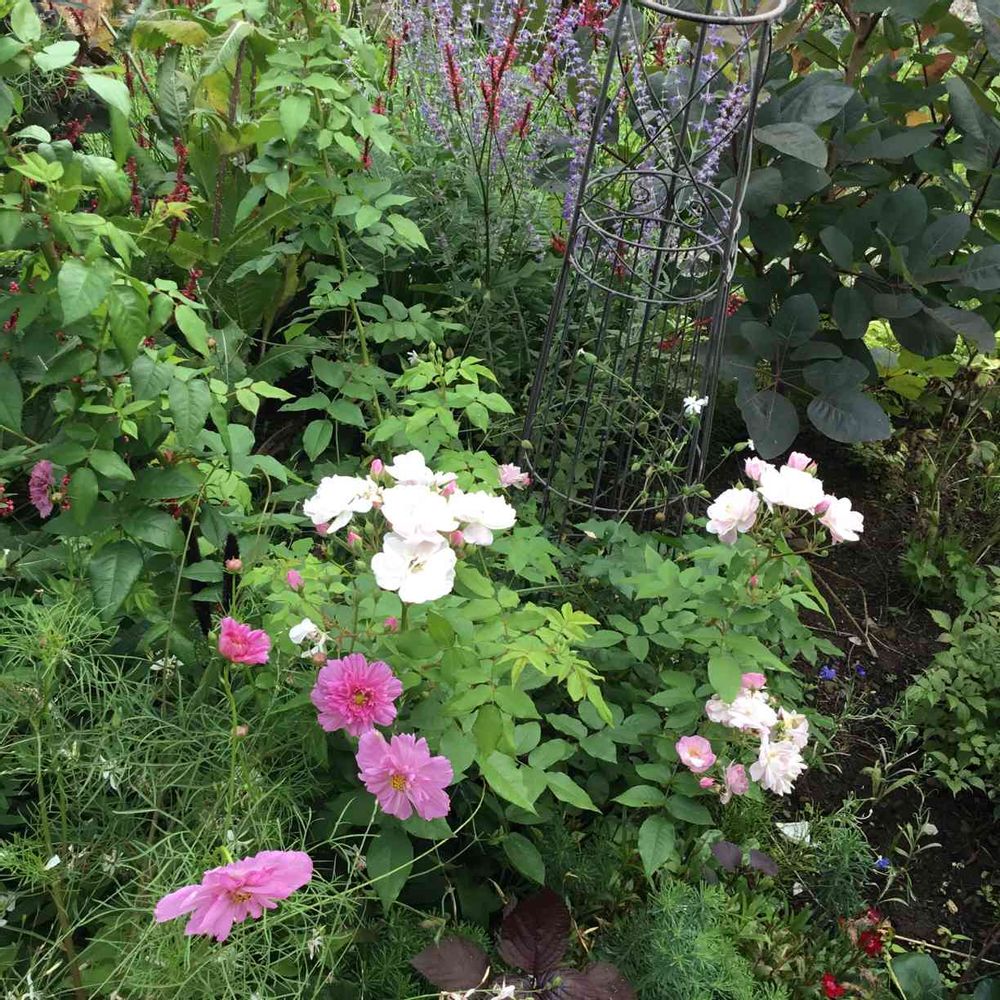 ブラッシュノワゼットの前にローズボンボン 後ろはロシアンセージ