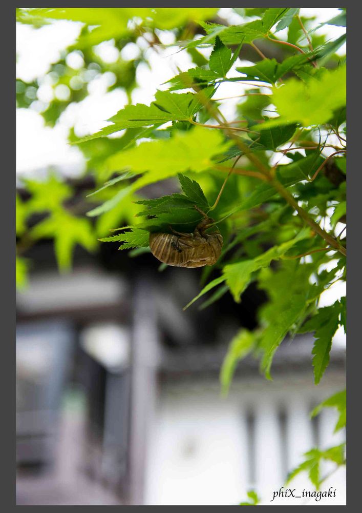商店街の名前にある、円頓寺に来ました。古い石碑と門をくぐるとイロハモミジの葉が陽に透けて綺麗です。今が盛のクマゼミの抜け殻が抱きついていました。